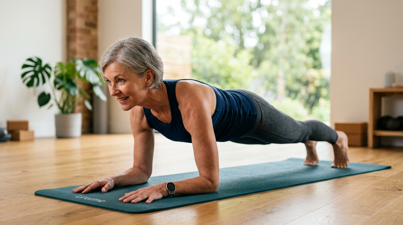 Inspirational image of a mature woman in her 50s or 60s performing a plank exercise on a mat with proper form, showing strength and confidence