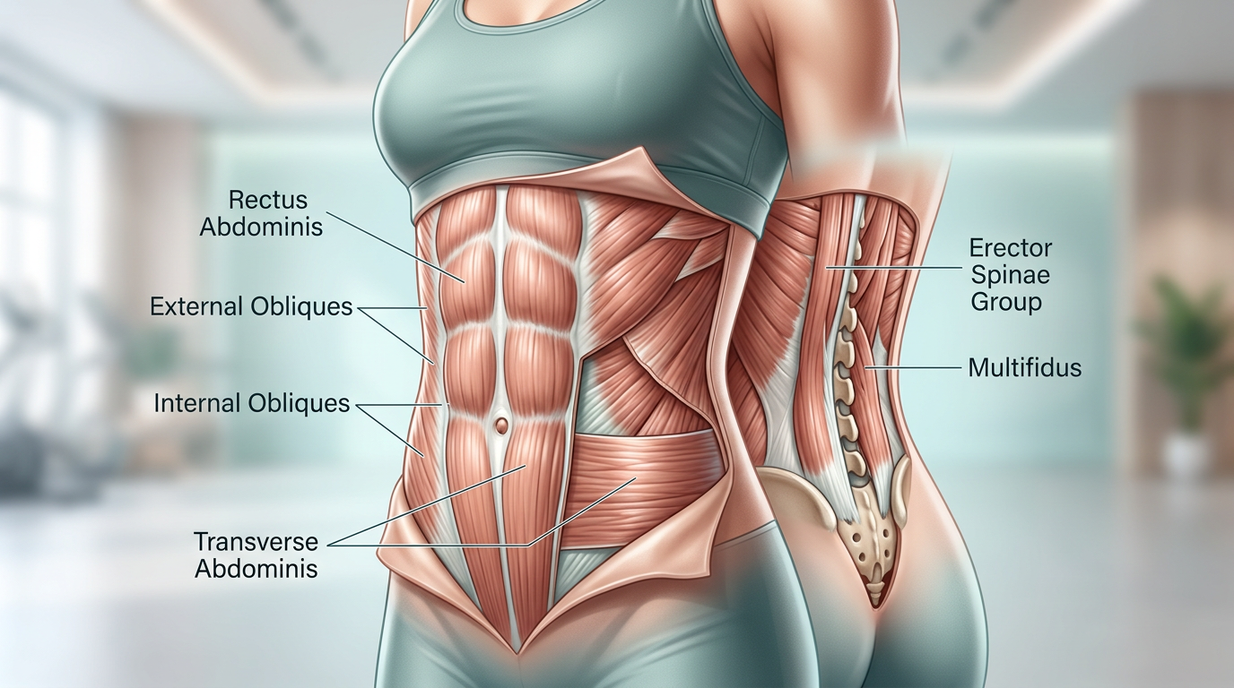 Anatomical diagram showing the layers of core muscles including rectus abdominis, obliques, transverse abdominis, and back muscles with clear labels