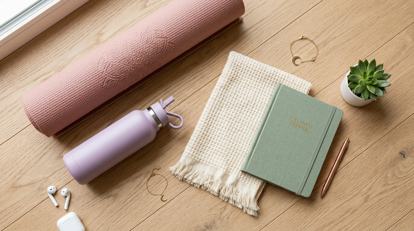 Flat lay of home workout essentials including a yoga mat, water bottle, towel, and workout journal on wooden floor creating an inviting exercise space