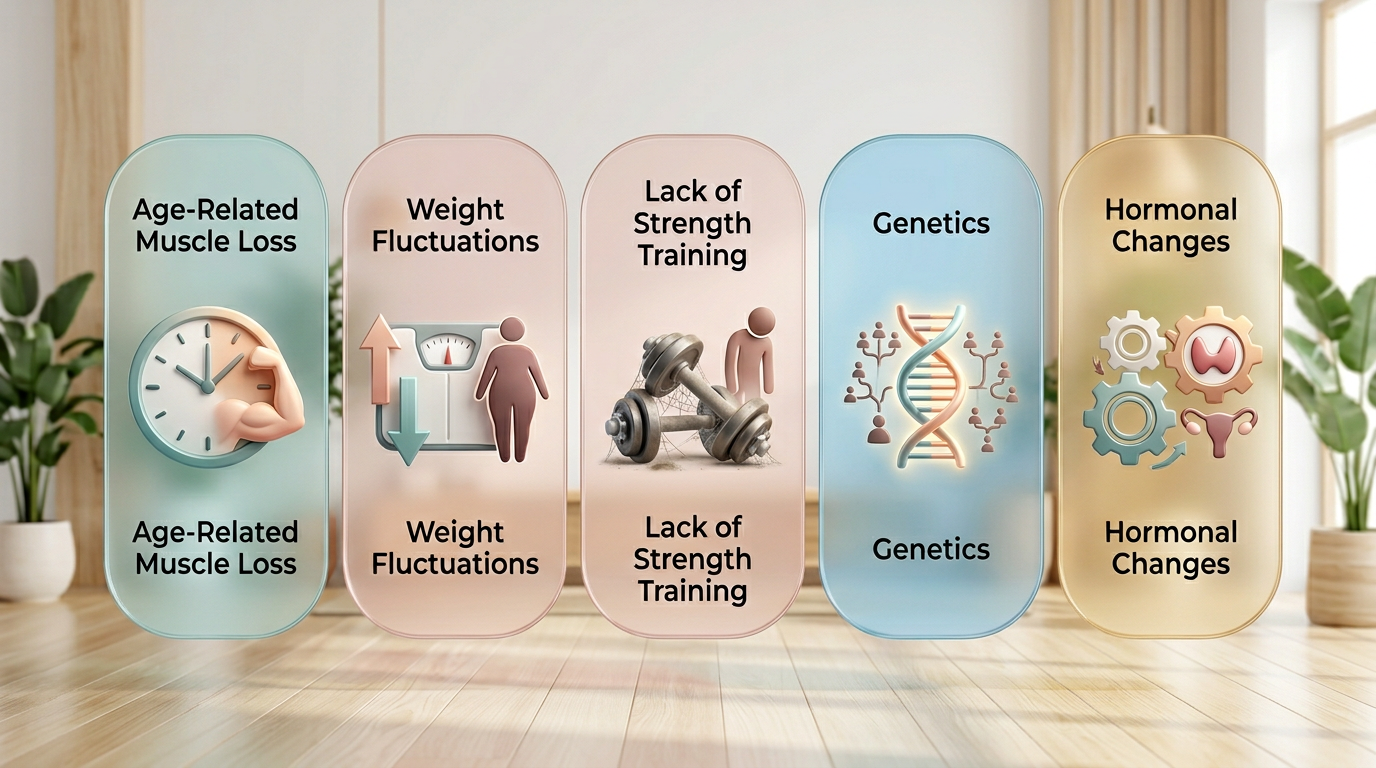 Sarcopenia, the natural loss of muscle mass with age, accelerates after age 30 and becomes more pronounced after menopause. Without regular resistance training, women can lose significant muscle tissue in their arms, leaving behind loose skin and reduced definition.