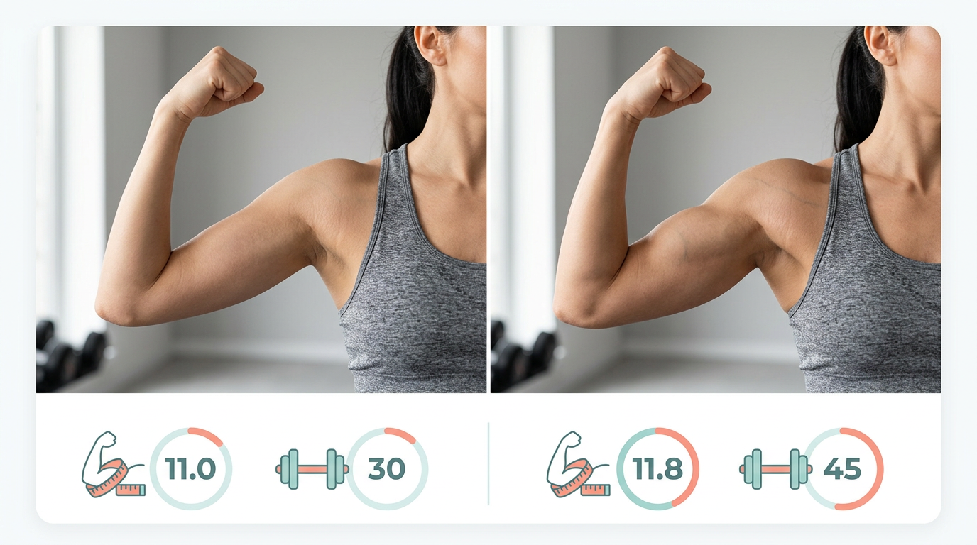 Track progress through measurements (measure your upper arms at the widest point), progress photos every 2-4 weeks, and how your clothes fit. These methods provide more accurate feedback about your physical transformation than scale weight alone.