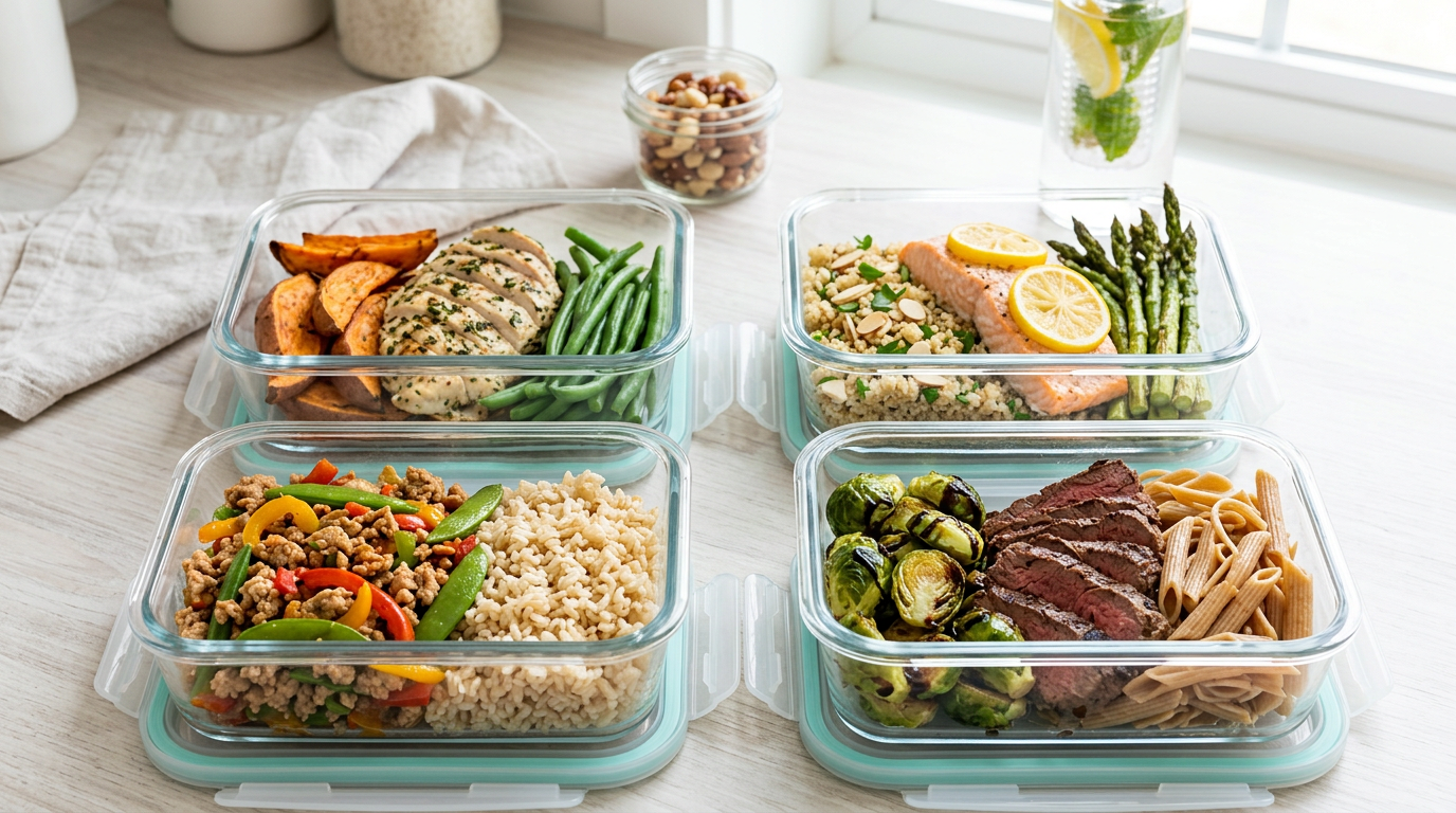 Meal prep containers showing balanced meals with lean protein, vegetables, and complex carbohydrates ideal for supporting muscle building and fat loss goals