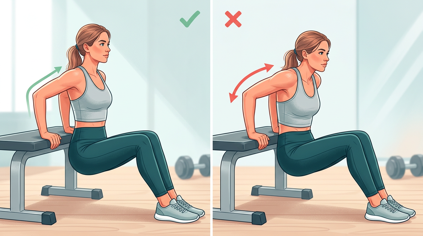 For bench dips: Sit on the edge of a bench with hands gripping the edge beside your hips. Slide your hips forward off the bench and lower your body by bending your elbows to 90 degrees. Press back up to straighten your arms. Keep your elbows tracking backward, not flaring out to the sides.