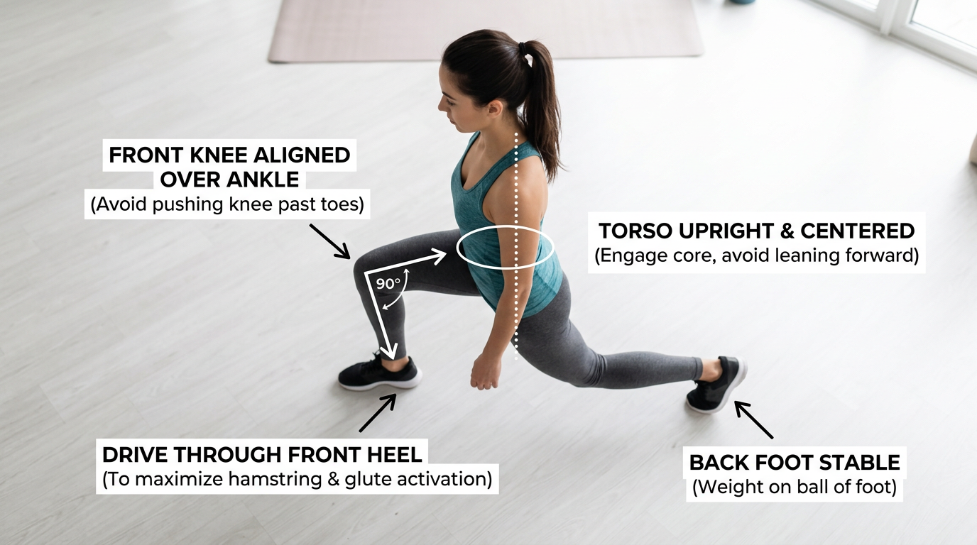 Perform 3 sets of 10-12 lunges per leg. Start with bodyweight to master the movement, then add dumbbells or a barbell for progressive overload. Maintain an upright torso throughout the movement—leaning forward shifts emphasis away from the hamstrings. Take a large enough step that your front shin remains vertical at the bottom position.