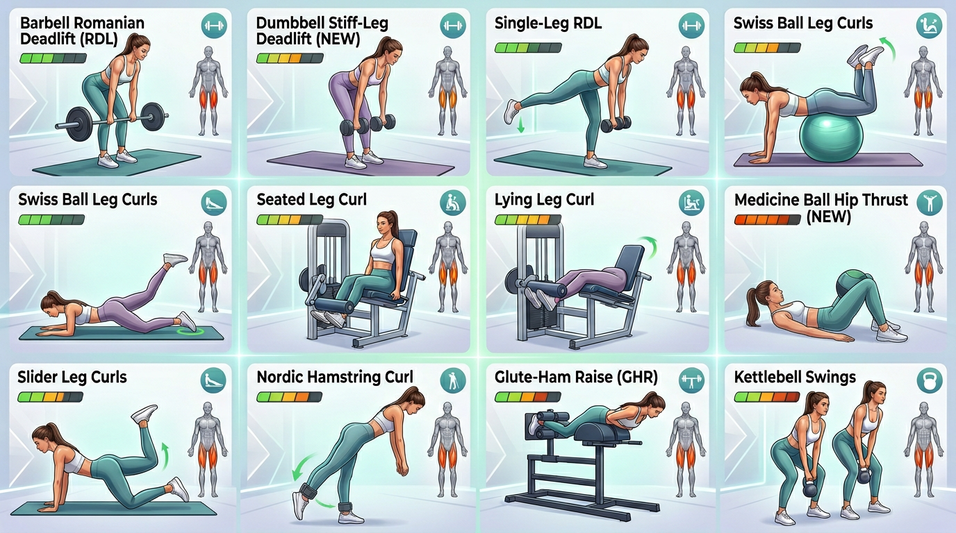 Infographic comparing the 10 best hamstring exercises with illustrations showing proper form for each movement, labeled with difficulty level and primary muscle focus