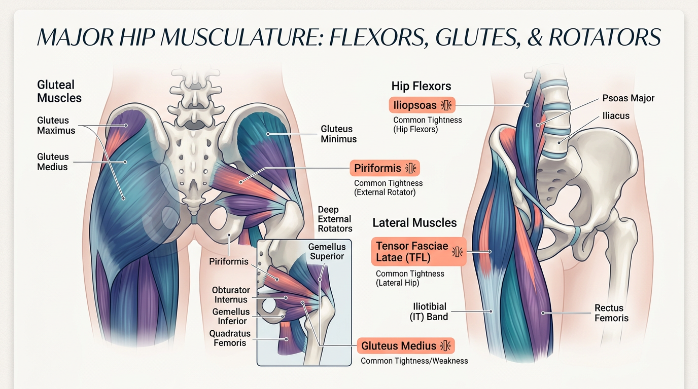 Anatomical illustration showing the major hip muscles including hip flexors, glutes, and external rotators with labels highlighting common tight areas