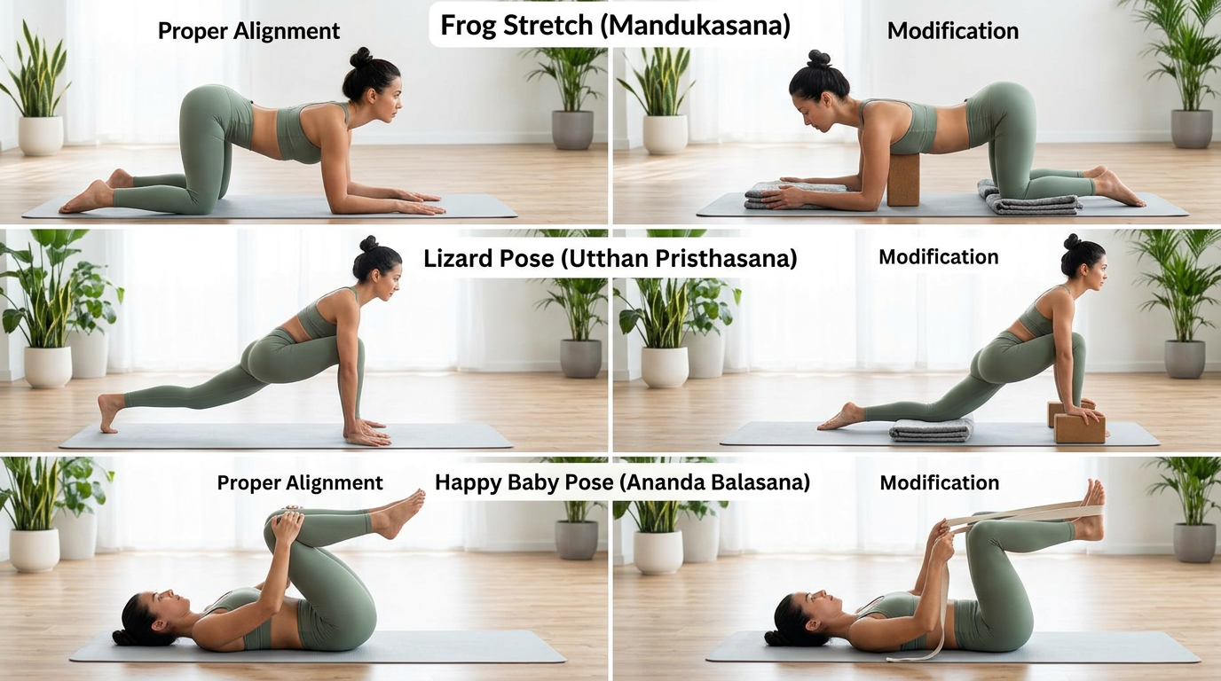 Demonstration photos of frog stretch, lizard pose, and happy baby pose showing proper alignment and common modifications