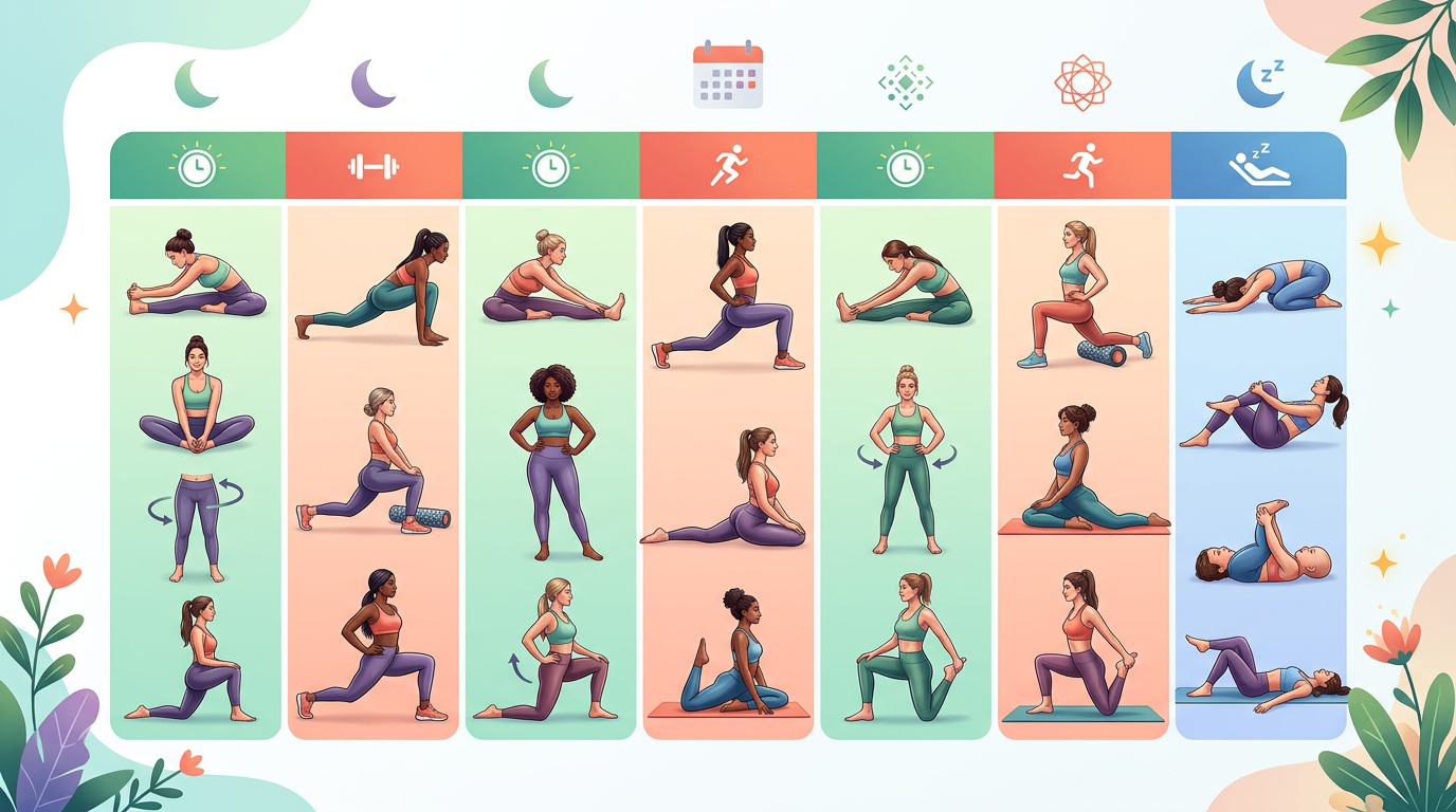 Infographic showing a sample weekly hip stretching schedule with different routines for post-workout, rest days, and daily maintenance