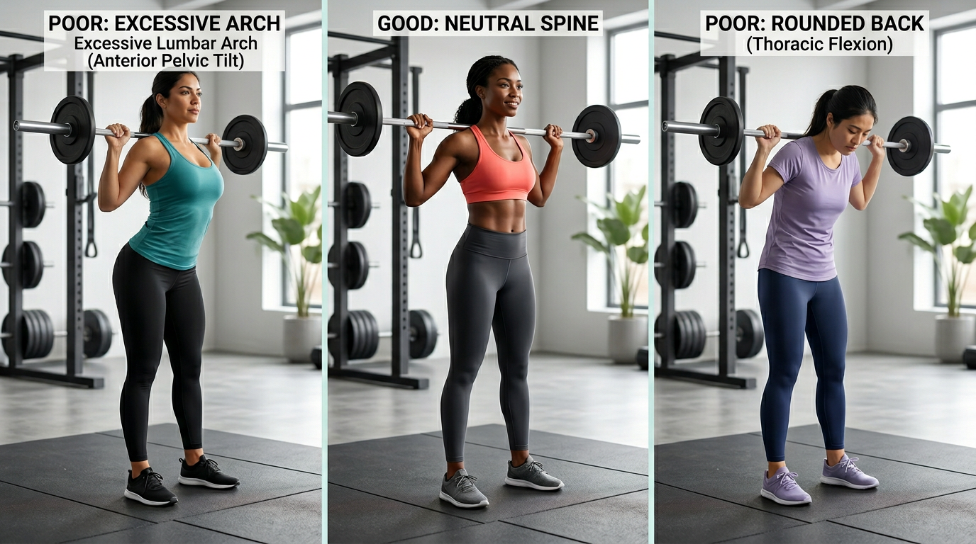 Side-by-side comparison showing correct neutral spine position versus common postural errors like excessive arch or rounded back during squat setup