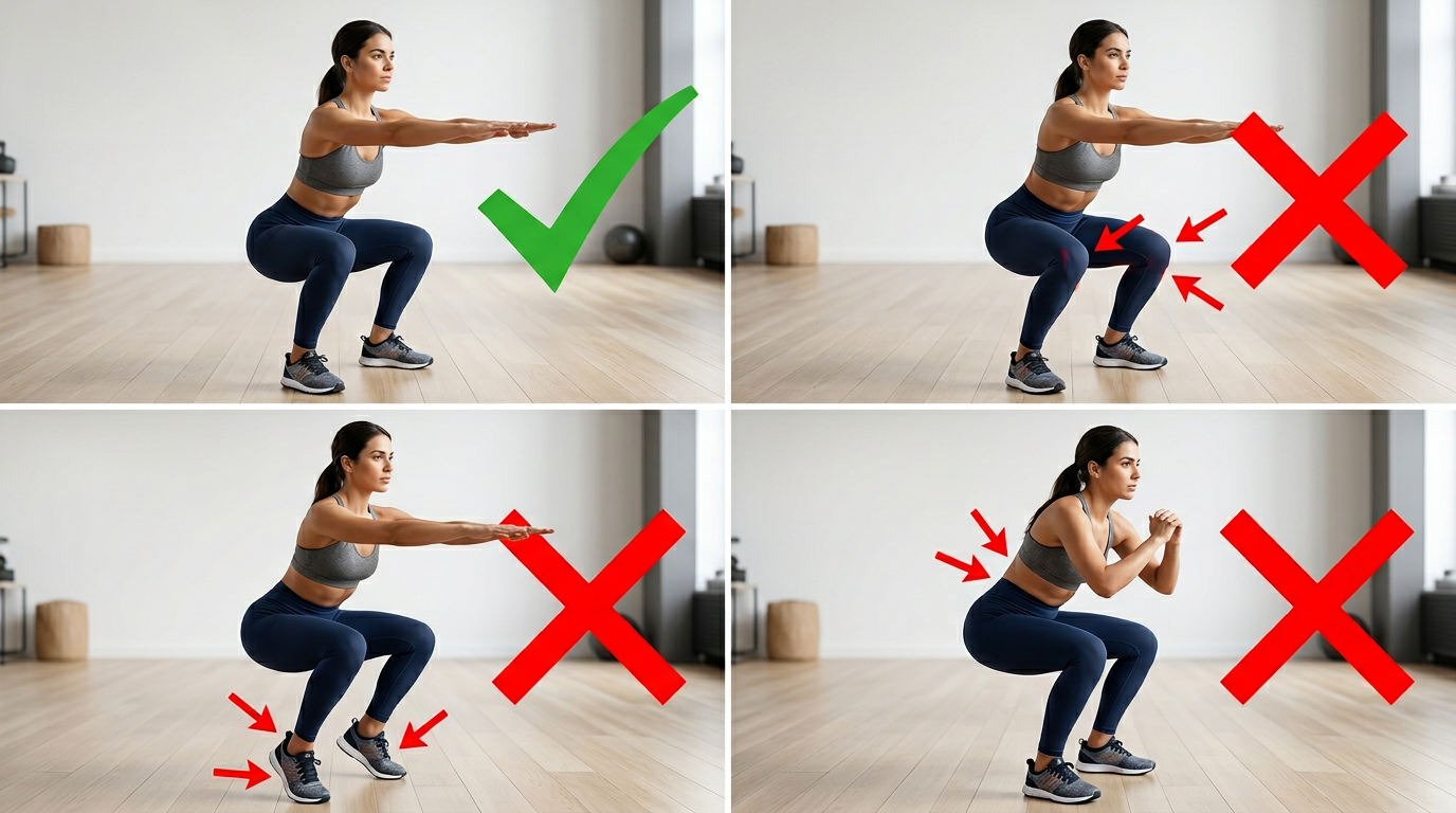 Split-screen comparison showing correct squat form versus common mistakes including knee valgus, heel lift, and back rounding with red X and green checkmark indicators