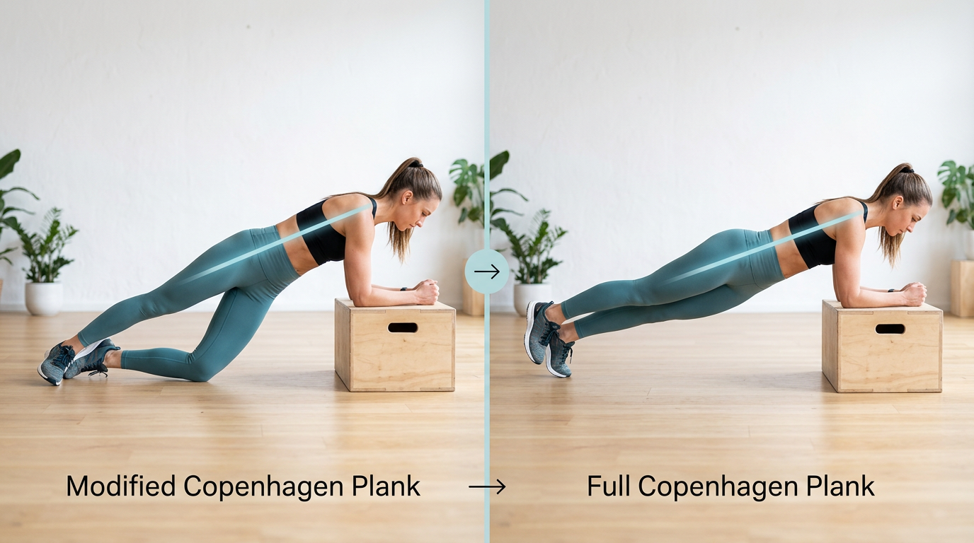 Step-by-step demonstration of Copenhagen plank progression from modified version with bottom leg on ground to full version with bottom leg elevated, showing proper body alignment