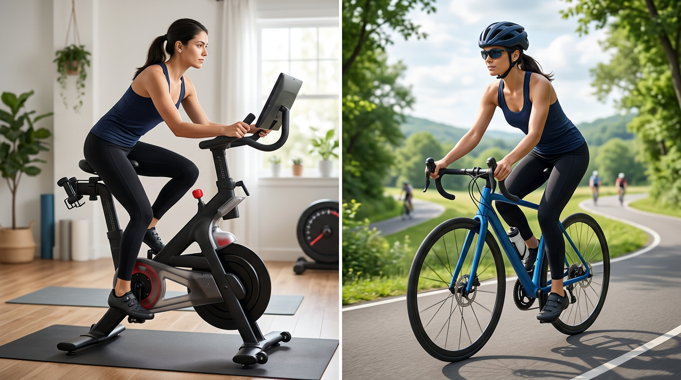 Split image showing a woman on an indoor stationary bike and outdoor cycling, highlighting proper posture and form for joint-friendly cycling