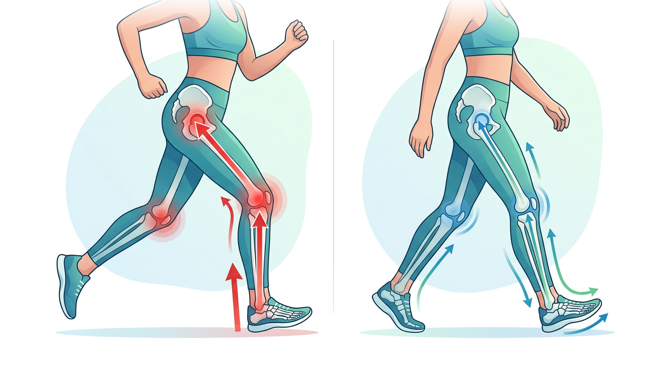 Anatomical illustration showing the difference in joint impact between high-impact running and low-impact walking, with arrows indicating force distribution on knee and hip joints