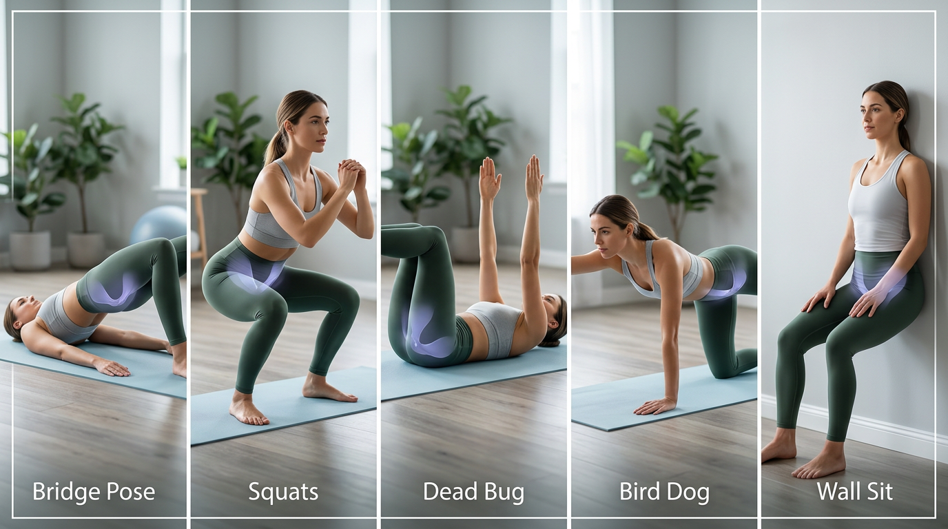 Collage showing proper form for five pelvic floor exercises including bridge pose, squats, dead bug, bird dog, and wall sits with anatomical highlights showing pelvic floor engagement