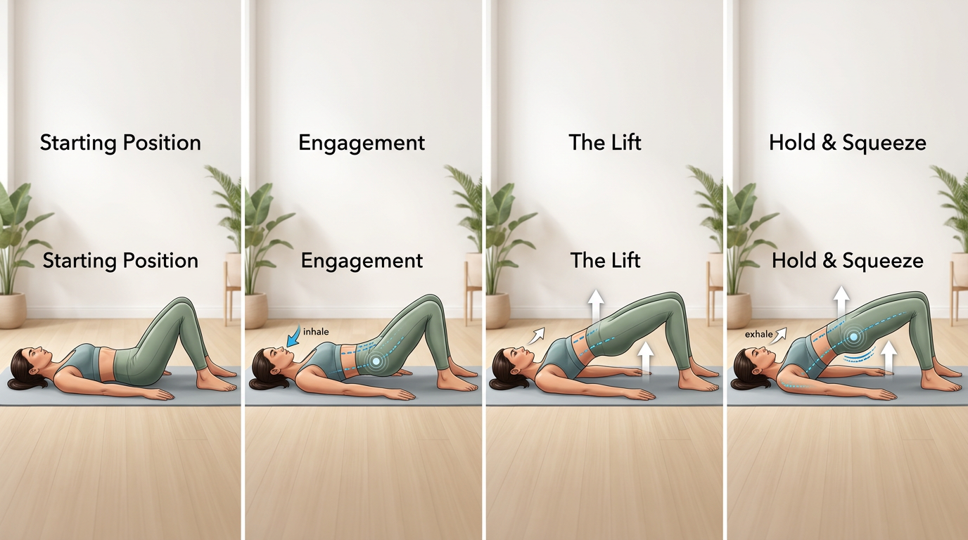 Sequence showing the bridge exercise from starting position through the lift with arrows indicating the upward hip movement and pelvic floor engagement, plus proper breathing cues