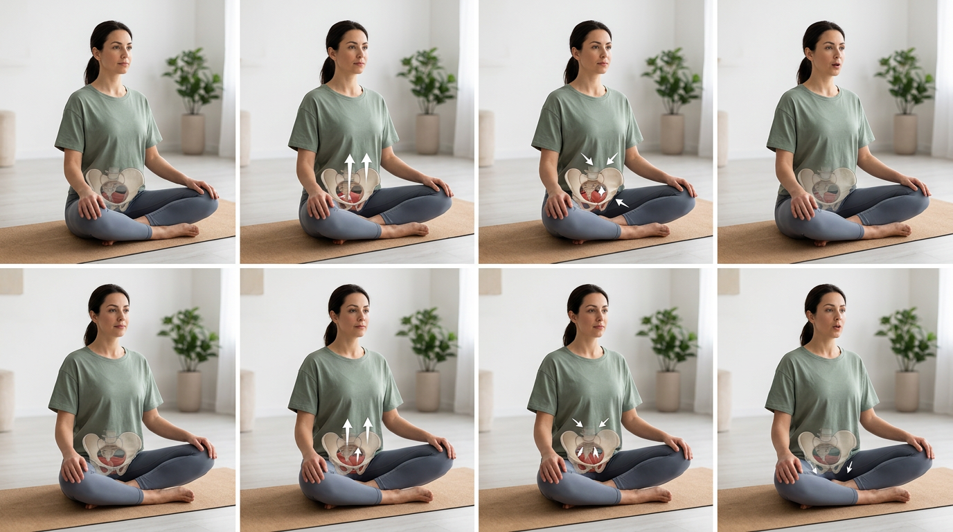 Step-by-step visual guide showing a woman in a comfortable seated position demonstrating proper pelvic floor engagement with anatomical overlay and directional arrows indicating the upward and inward contraction