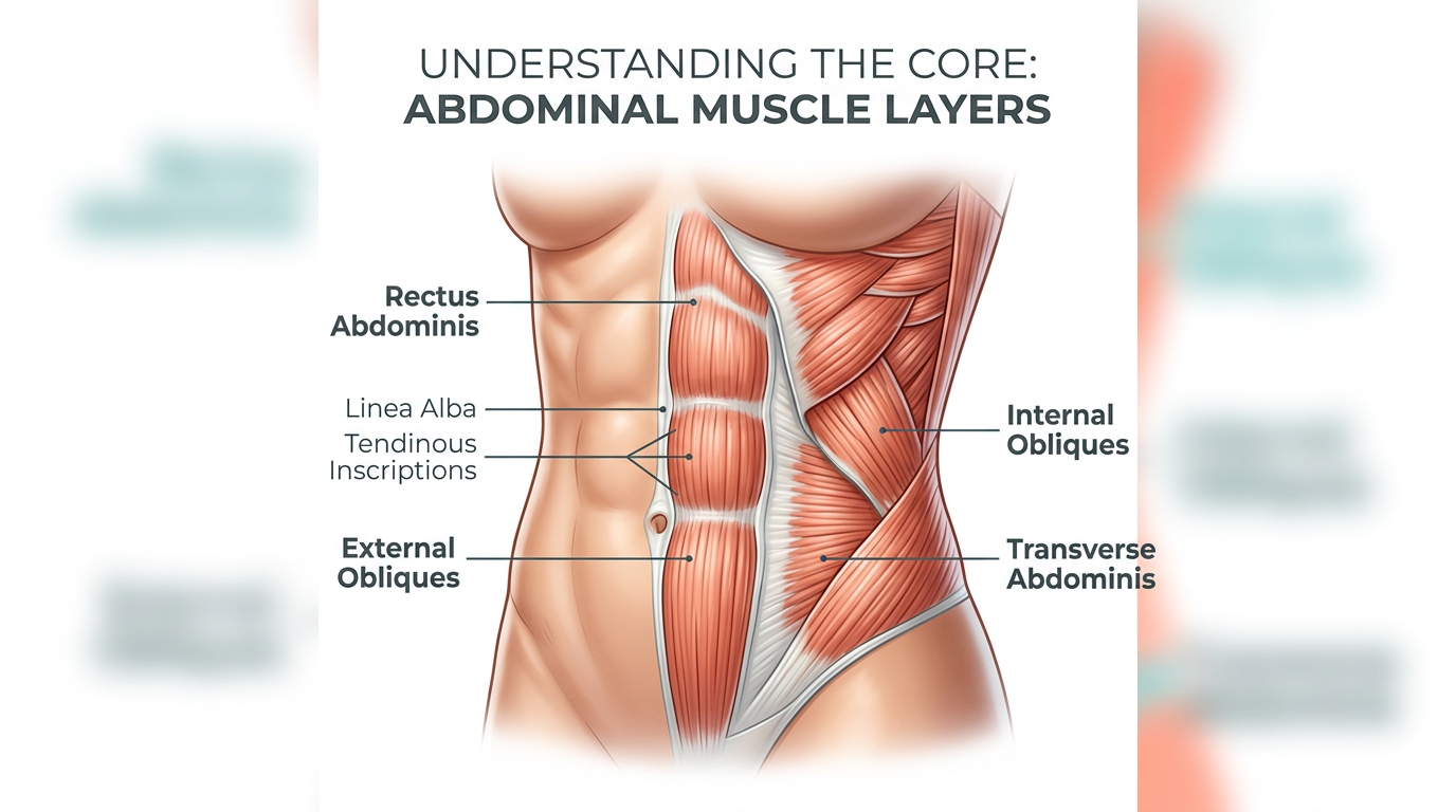 Anatomical illustration showing the layers of abdominal muscles including rectus abdominis, external obliques, internal obliques, and transverse abdominis with labels