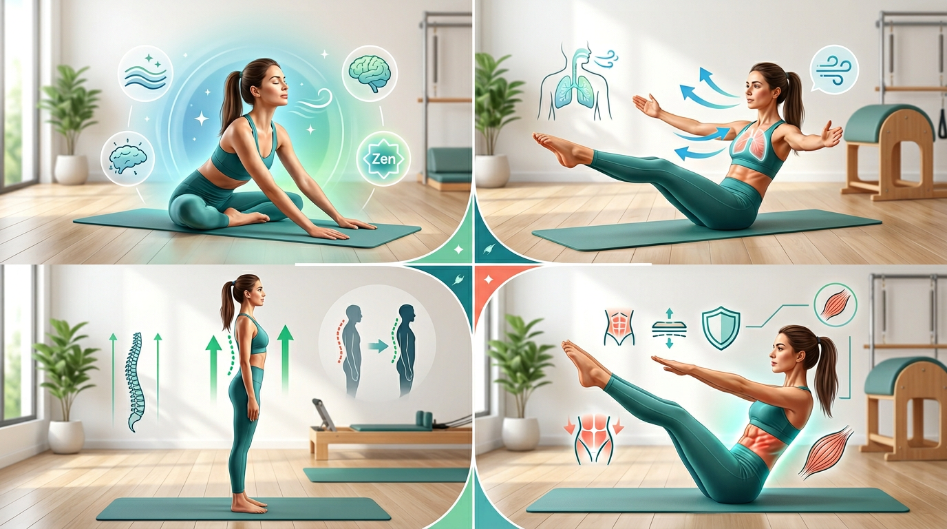 Infographic showing the mind-body benefits of pilates including stress reduction, improved breathing, better posture, and core strength