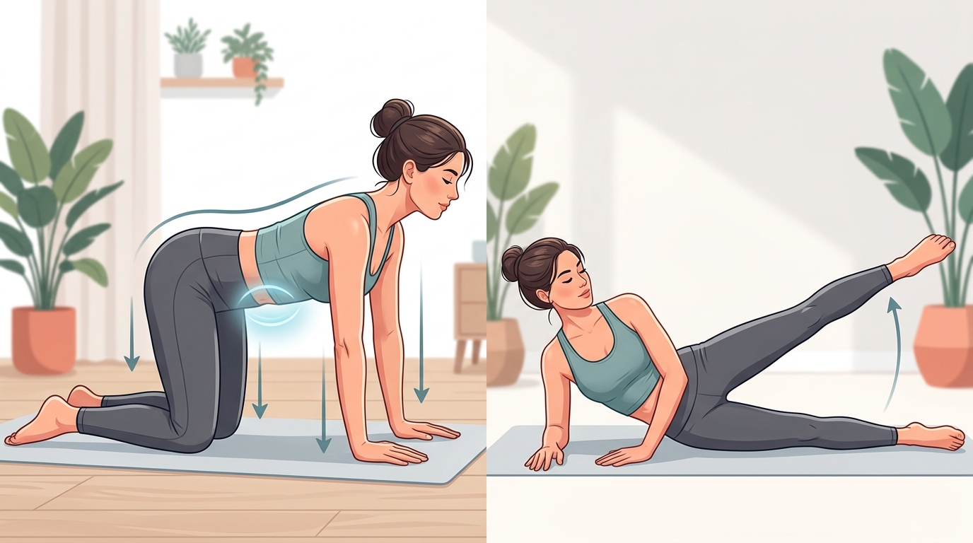 Woman demonstrating modified pilates exercises for diastasis recti, showing side-lying leg lifts and all-fours position with neutral spine