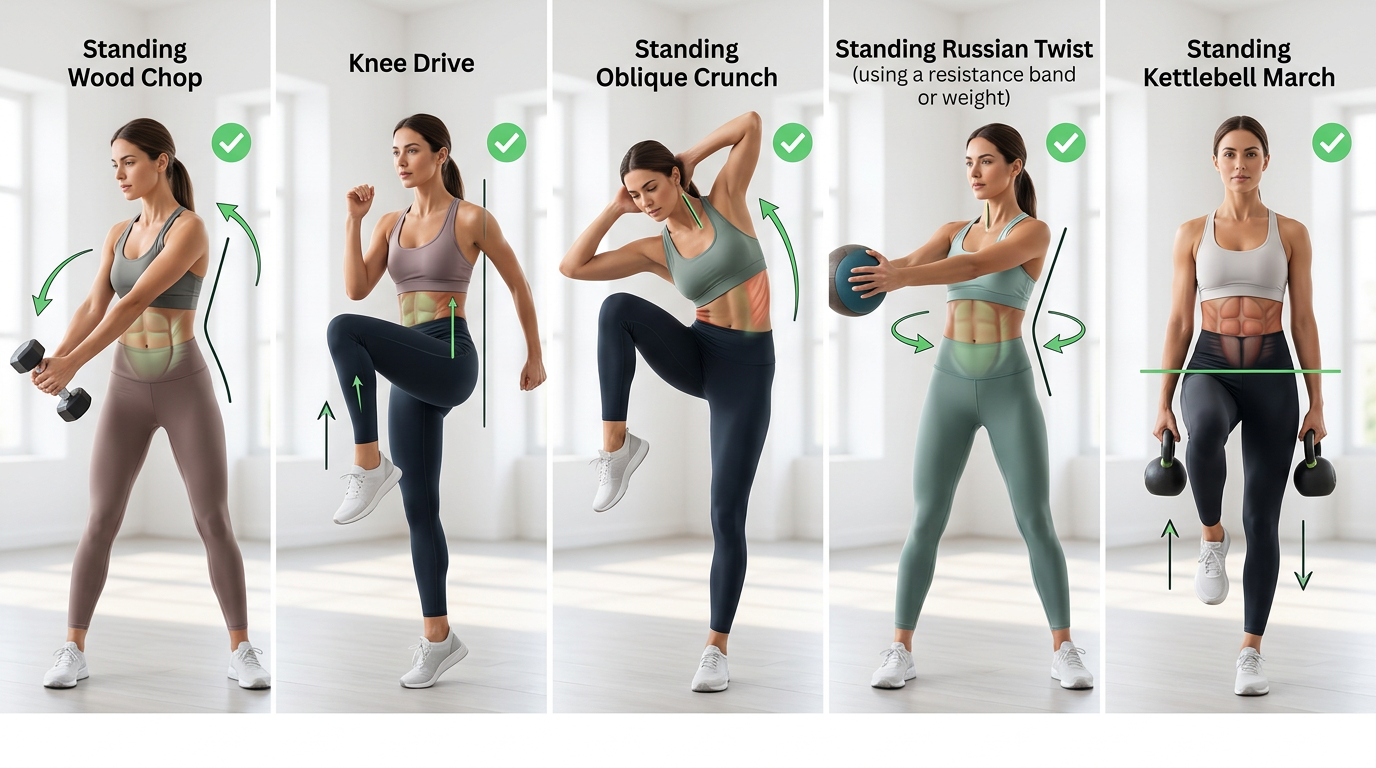 Standing core exercises are strength movements performed upright that engage your abs, obliques, and deep stabilizers without floor work. The most effective include wood chops, standing knee drives, and overhead marches, which challenge balance and coordination while building functional core strength for daily activities and athletic performance.