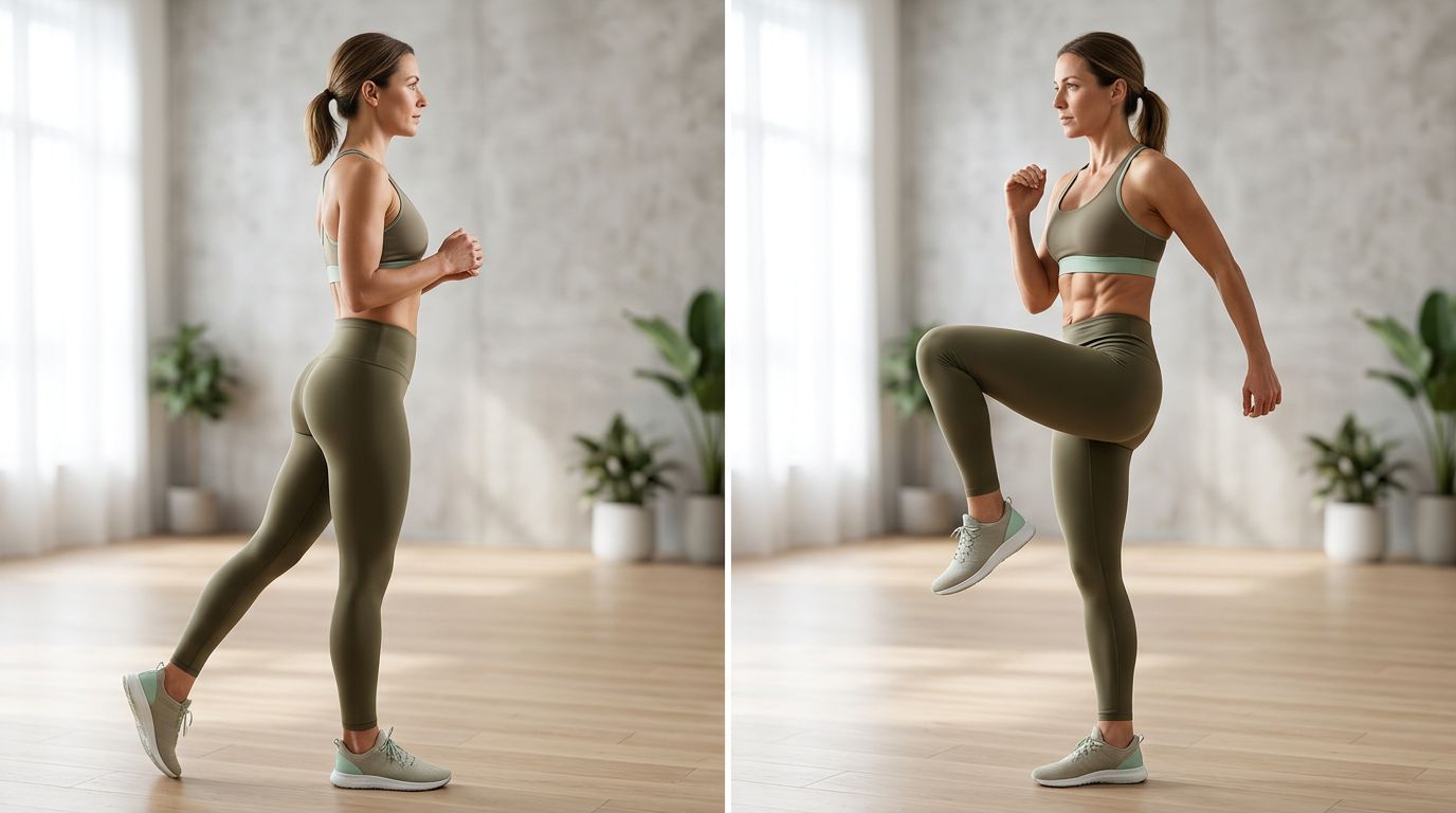 This exercise challenges your balance while engaging your entire core, particularly your lower abs and hip flexors. Stand on your right leg with your left leg extended behind you and arms overhead. Drive your left knee up toward your chest while simultaneously bringing your arms down. Return to the starting position with control.