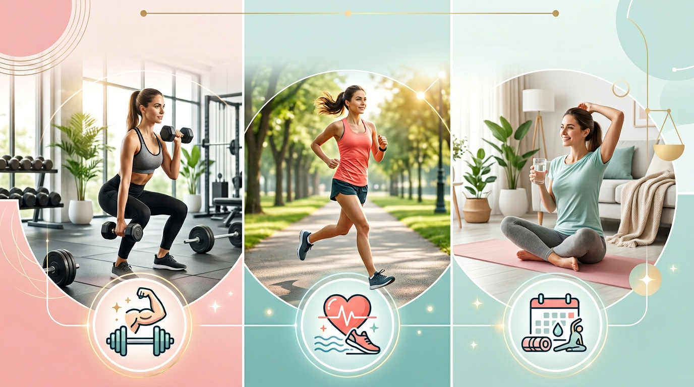 Infographic showing the three pillars of an effective weekly workout plan: strength training, cardiovascular exercise, and recovery days with icons for each component