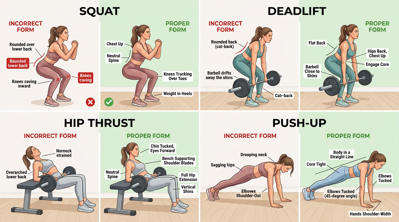 Side-by-side comparison images showing proper form for key compound exercises including squats, deadlifts, hip thrusts, and push-ups with form cues labeled