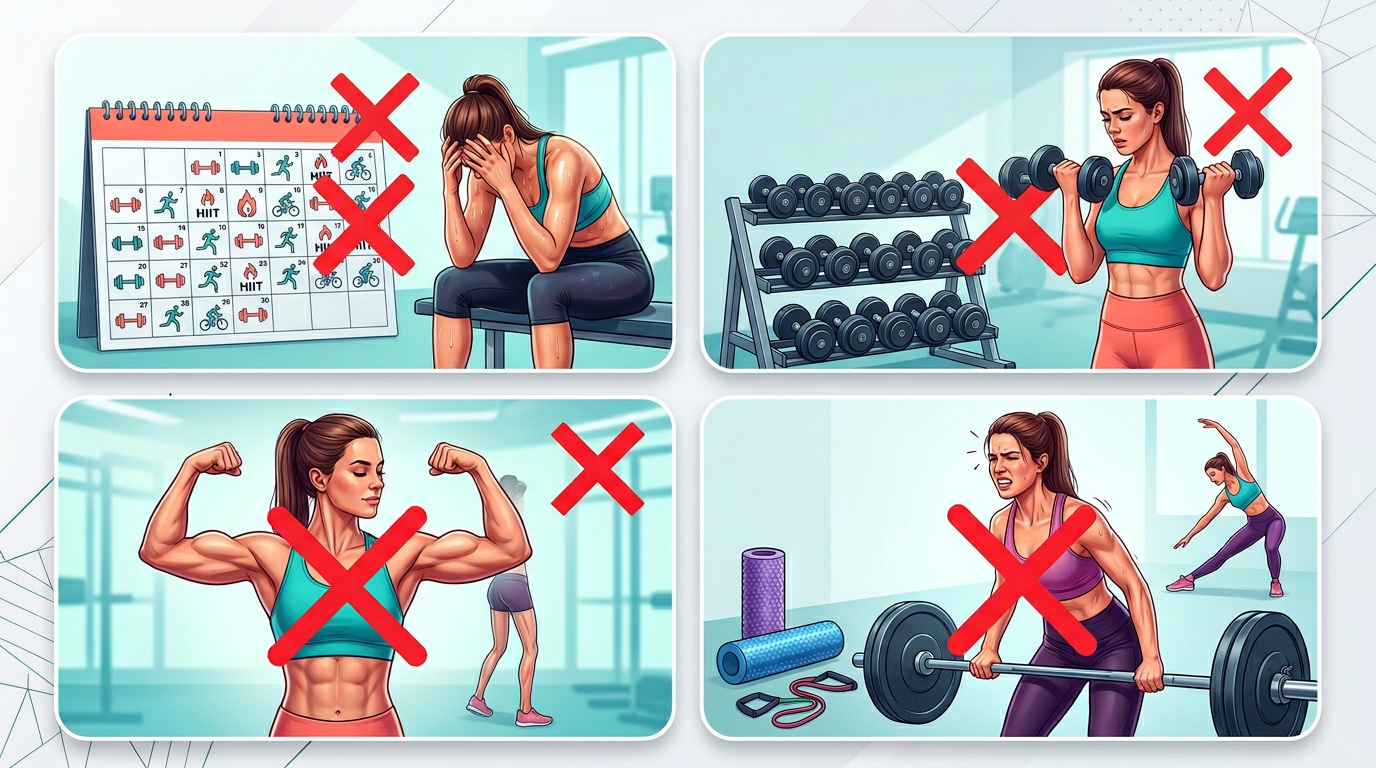 Visual checklist showing common workout plan mistakes with red X marks: overtraining calendar, same weights every week, imbalanced muscle group training, and skipping warm-ups