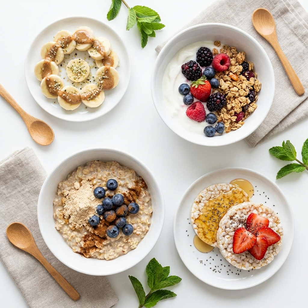 - Example: Oatmeal with protein powder and banana, or Greek yogurt with granola and berries