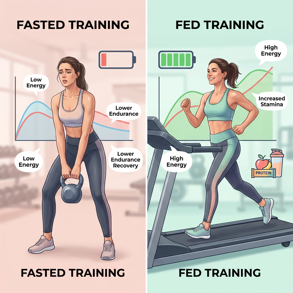 Comparison image showing a woman training fasted versus after eating a pre-workout snack, with energy level indicators and performance metrics displayed