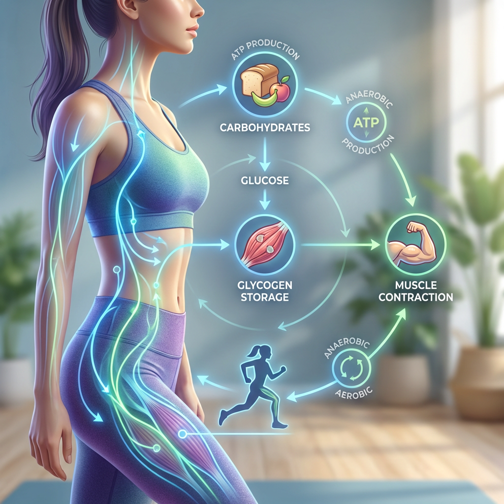 Infographic showing how carbohydrates convert to glycogen and fuel muscle contractions during exercise, with a diagram of energy pathways in the female body